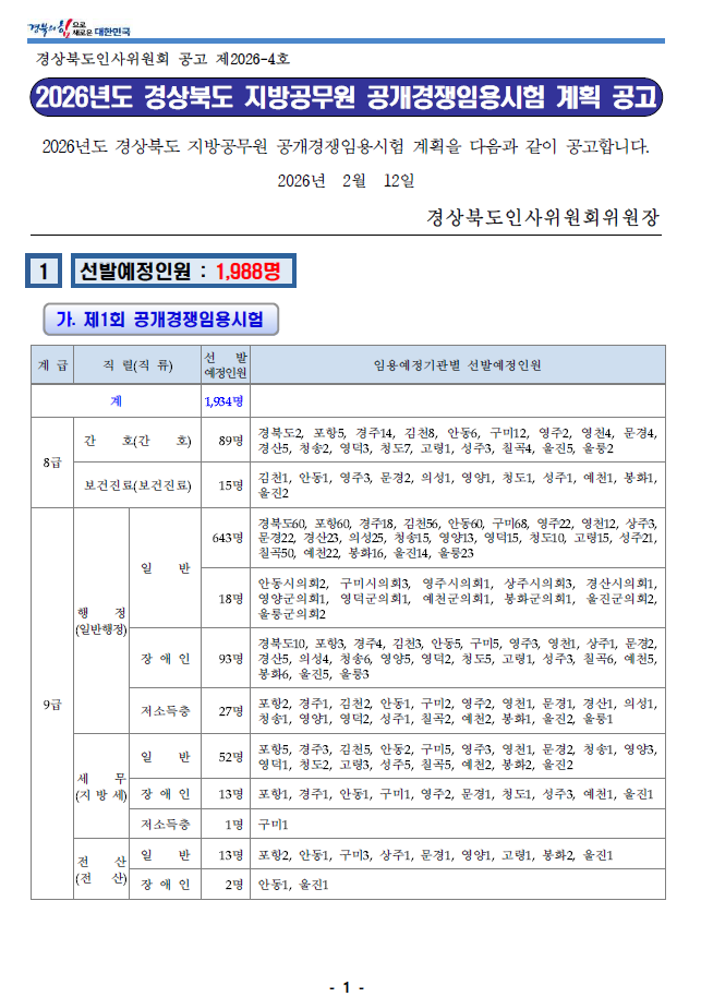 2026년 경상북도 지방공무원 임용시험 시행계획이 공고되었습니다.