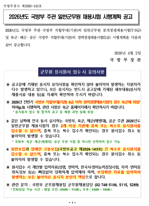 [군무원] 2026년도 국방부 주관 일반군무원 채용시험 시행계획 공고