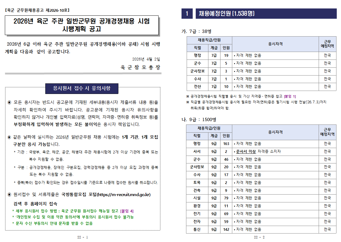 [군무원] 2026년도 육군 주관 일반군무원 채용시험 시행계획 공고