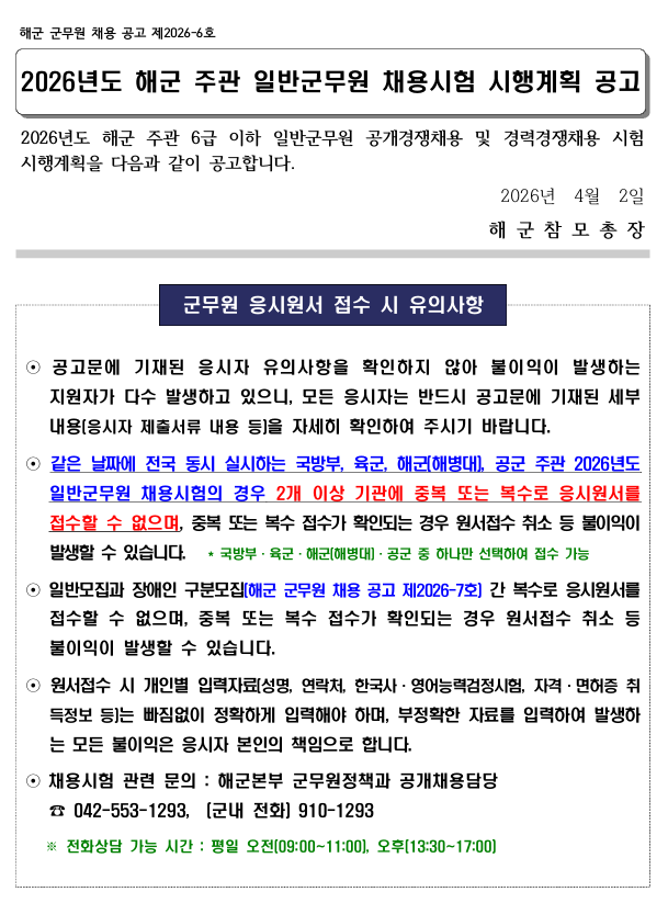 [군무원] 2026년도 해군 주관 일반군무원 채용시험 시행계획 공고