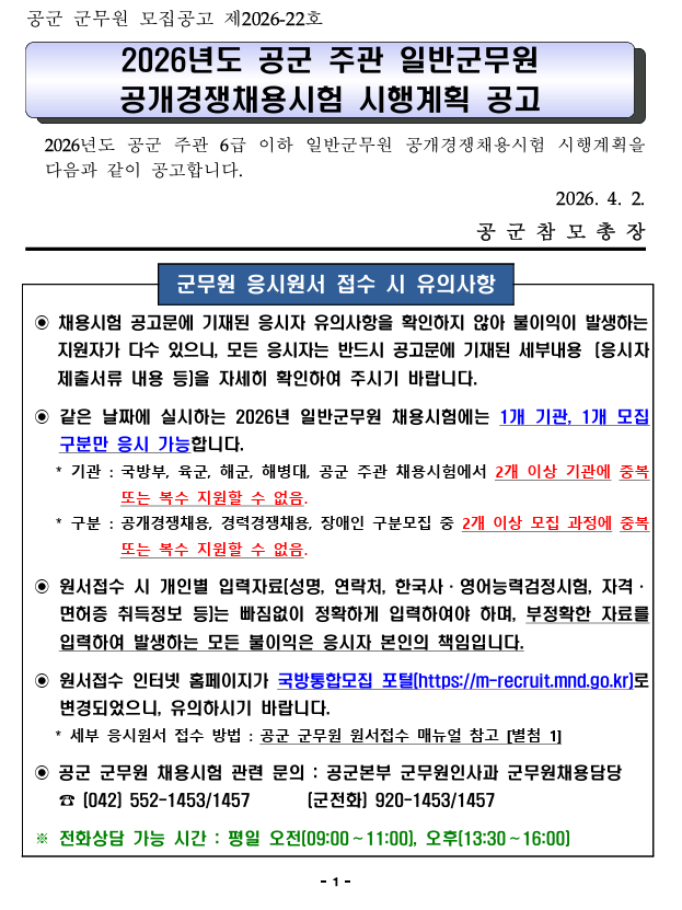2026년 공군 주관 일반군무원 채용시험 시행계획이 공고되었습니다.