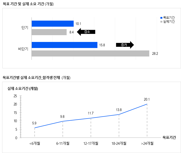 반면, 비단기 합격생은 평균 15.8개월을 목표로 했지만, 실제로는 28.2개월이 소요되어