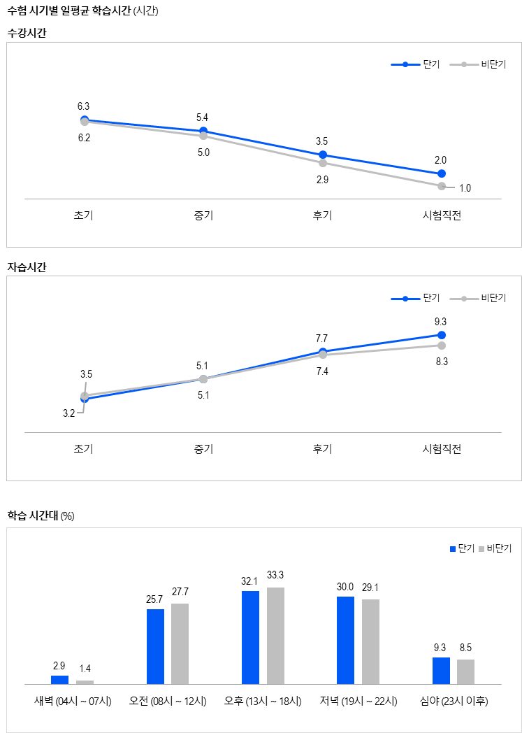 특히, 자습시간의 경우 단기 합격생이 시험 직전에 9.3시간으로 가장 높았고, 비단기 합격생은 8.3시간으로 단기 합격생보다 적었습니다.