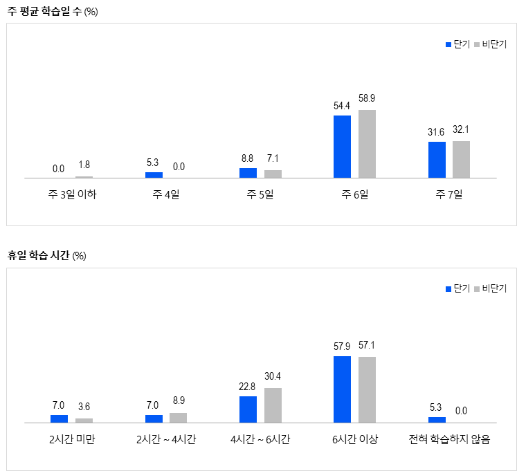 주 7일 학습 비율은 단기 합격생 31.6%, 비단기 합격생 32.1%로 나타나,