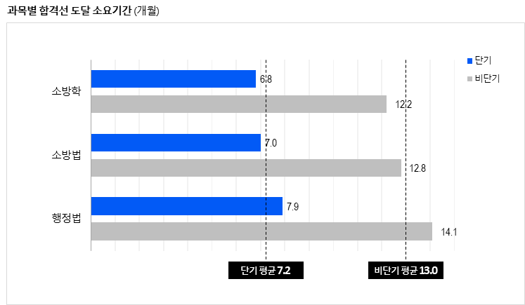 단기 합격생은 소방학개론 6.8개월, 소방관계법규 7개월, 행정법 7.9개월이 걸려 과목별 합격선에 도달한 것으로 나타났습니다.