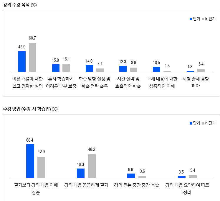강의 수강 방법에서는 '필기보다 강의 내용 이해에 집중'하는 비중이 단기 합격생 68.4%, 비단기 합격생 42.9%로 모두 가장 높았습니다.