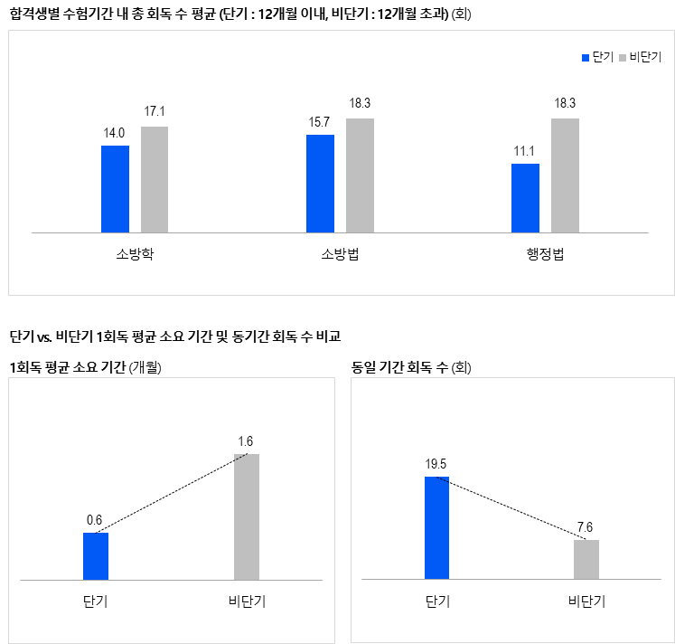 반면, 비단기 합격생은 소방학 17.1회독, 소방법 18.3회독, 행정법 18.3회독으로 모든 과목에서 단기 합격생보다 회독 수가 많았습니다.