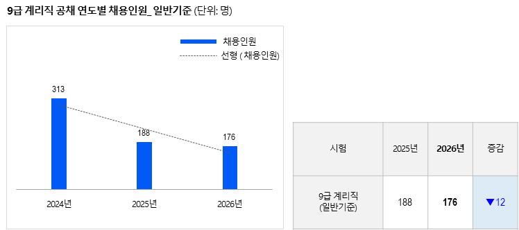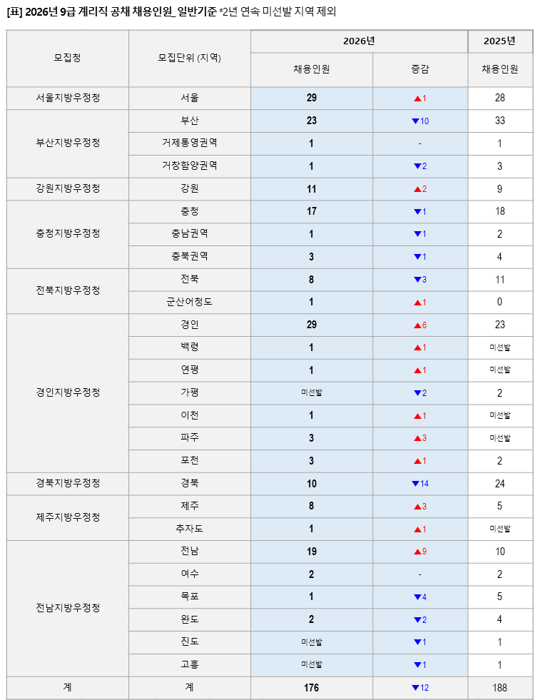 2026년 9급 계리직 채용인원은 일반전형 합계 기준 176명으로, 2025년 188명과 비교하여 총 12명이 줄어들었다.